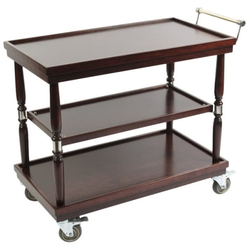 Serve your guests in style with this Bon Chef 50040 37 1/2" x 19 1/2" x 31" Classic mahogany guerridon trolley. Boasting a hardwood construction with a mahogany finish, this trolley adds sophistication to any event. Thanks to the 3 wooden shelves, you can transport desserts, entrees, or beverages right to your guests. This trolley is also great for tableside demonstrations to impress your guests with the finishing touches on their carefully prepared meals. A stainless steel and brass handle provides a comfortable grip as you push this trolley. Plus, the 4 casters allow for easy mobility. Ideal for use in hotels, casinos, or fine dining restaurants, this trolley is the perfect addition to your establishment!