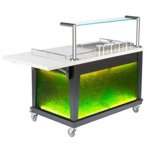 Offer food and drink service with a flair using this Bon Chef 50044 54 1/2" x 30" x 49" green and silver guacamole tequila cart. It's sure to capture all the attention in the room with its back-lit front and side textured acrylic panels. The bright pop of green color enhances this piece so that it draws every eye in your restaurant towards the delicious food and drinks at hand. Plus, thanks to its 4 heavy duty, non-marking casters the cart be pushed to the optimal location for set up. The unit also has 2 casters that lock to ensure safety while it is in use.