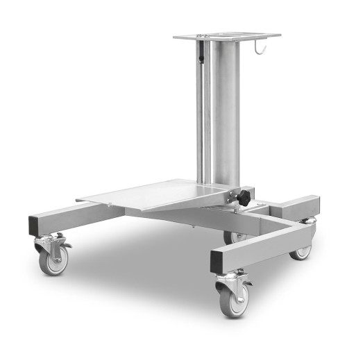 • with base frame and 4 lockable rubber-tired swivel casters (optimal working height with base frame: 928 mm), optimized stability through height compensation (25 mm) even on uneven floors, with height-adjustable and foldable storage stand