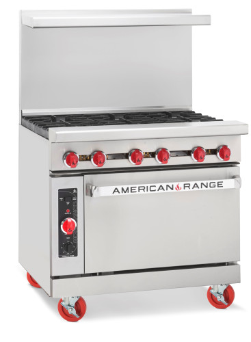 This American Range AR6, is a heavy duty 6 burner range, fitted with high powered 9kw double crown burners (32,000 btu's) for high performance, and heavy gauge welded construction to give durability