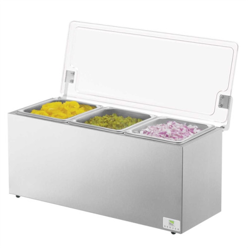This stainless steel station is insulated and features a hinged lid with the option of stay-open and self-close operation. The clear lid showcases your toppings and makes checking product levels quick and easy. The IRS-3 accepts three 1/6-size steam table pans or one 1/6-size steam table pan and three 1/9-size pans, 6" (150 mm) deep. Your contents can be chilled with ice or three universal ice packs. Pans and ice packs are sold separately.