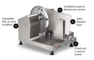 Major Slice 300V & 350V ­Entirely Stainless Steel. ­Aisi 304. Corrosion resistant. ­Running reliability and cleaning facility thanks to its design with a removable carriage. ­Very rigid structure. ­Great precision slice thickness regulator: from 0 to 25 mm. VARIOCUT® system. ­Driving by gearing. ­Independent sharpener, very easy to use. A simple operation of the control knob of thickness allows a perfect sharpening. Moreover, this operation can be done by novice person. ­Sliding carriage very flexible thanks to its guide system adjusted and supersized. The strength and quality of the components associated to the attention brought to assembling and fitting operations guarantee a perfect slicing, even very fine, and a total satisfaction for users during many years. ­Equipped with a motor Monophase. ­Indication of waterproofness IP 67