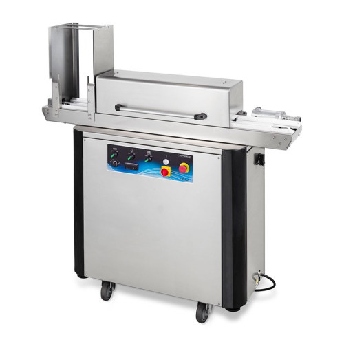 Designed for loading and automatic pre-heating of polycarbonate molds (175x275) A loading tower molds feeds the tape to step of pre – heating effected by four infrared lamps inside a cover. Possibility to load manual or automated connected to existing machines. Speed and temperature of heating are managed TECHNICAL CHARACTERISTICS: Totally AISI 304 stainless structure Possibility to use with different sizes of molds: ( 135 x 275 – 175 x 275 – 205 x 275 ) Variable speed of belt Heating adjustable through digital intrument Quantity mould of tower load nr. 16 Inspection of area lamp infrared Easy handing of working belt for cleaning and washing operations Volt 100/240 – Hz 50/60 – Kw 1,2 single-phase ( special voltages on request). Dimensions: mm 500 x 1450 x h. 1480