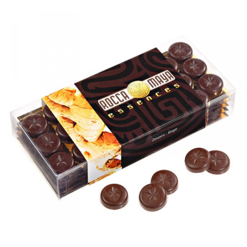 Rocca Maya Essences Ginger are a collection of small buttons 5 g each. Excellent 60% dark chocolate flavored with infusions of ginger in cocoa butter.