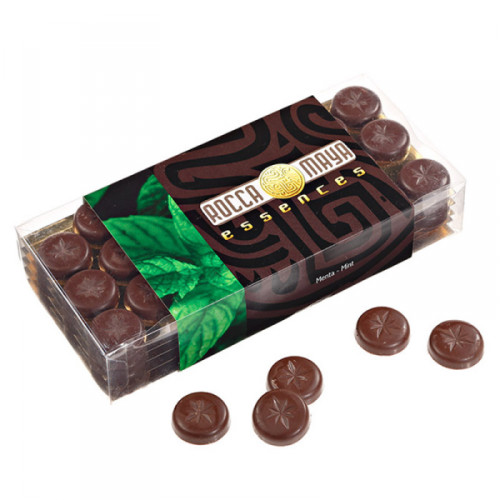 Rocca Maya Essences Mint are a collection of small buttons 5 g each of excellent 60% dark chocolate flavored with infusions of mint in cocoa butter.