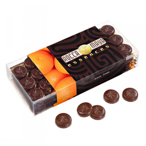 Rocca Maya Essences Orange are a collection of small buttons 5 g each of excellent 60% dark chocolate flavored with infusions of orange in cocoa butter.