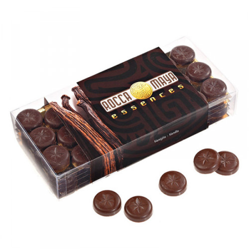Rocca Maya Essences Vanilla are a collection of small buttons 5 g each of excellent 60% dark chocolate flavored with infusions of vanilla in cocoa butter.