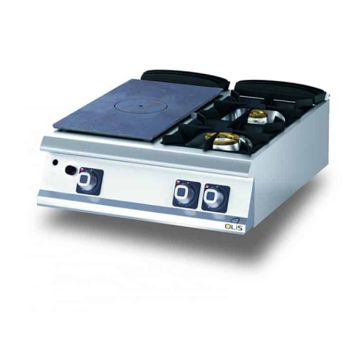 Olis gas cooktop with two high-powered burners and a 2mm thick satin-finish AISI 304 stainless steel worktop. The control panel features user-friendly, angled knobs. The large knobs are flush with the cooktop body. Easy to install and compliant with CE regulations. Dimensions (W x D x H): 800 x 900 x 280 mm.