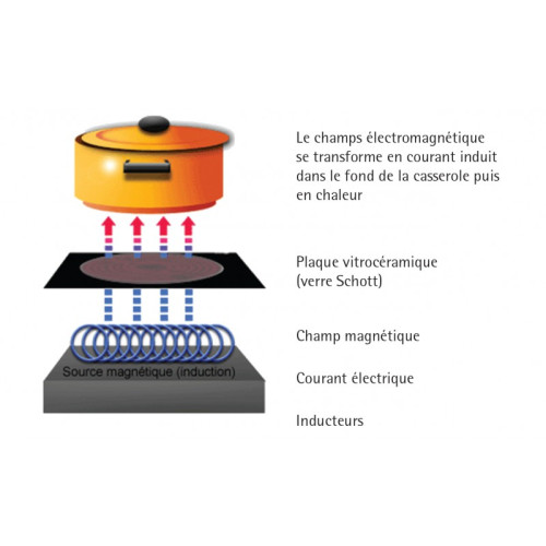 Perfectly even distribution of heat over the entire surface of the pan. No loss of performance, even if the diameter of the pan is smaller than that of the cooking zone. Very little heat loss since the heat is produced directly in the bottom of the container, without any intermediary.