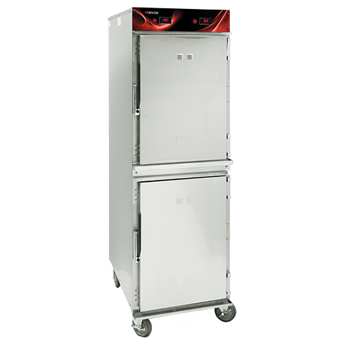 Heated cabinet has two separate compartments and controls for flexibility in hot holding needs.