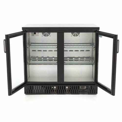 Beautiful black bar cooler 2-door. Ideal for bottles, cans and snacks. Equipped with 2 doors. Doors with double glazing. Dixell digital temperature controller.