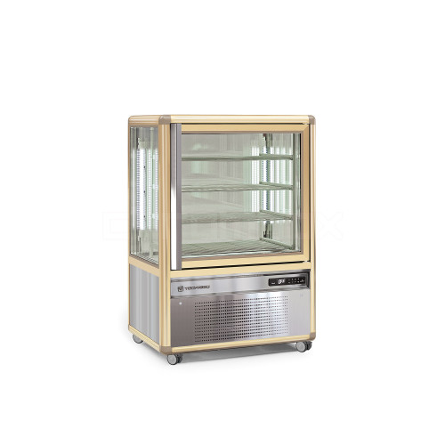 The upright refrigerated showcase series SNELLE is the elegant showcase series from the Italian manufacturer Tecfrigo designed for pastry shops and ice cream parlors. Cakes, canapées, drinks or homemade ice cream can be presented to promote sales in this free-standing refrigerated display case with all-round visibility. The door handle is embedded on the side along the entire length of the door. The dessert showcase has triple insulation glazing on 4 sides.