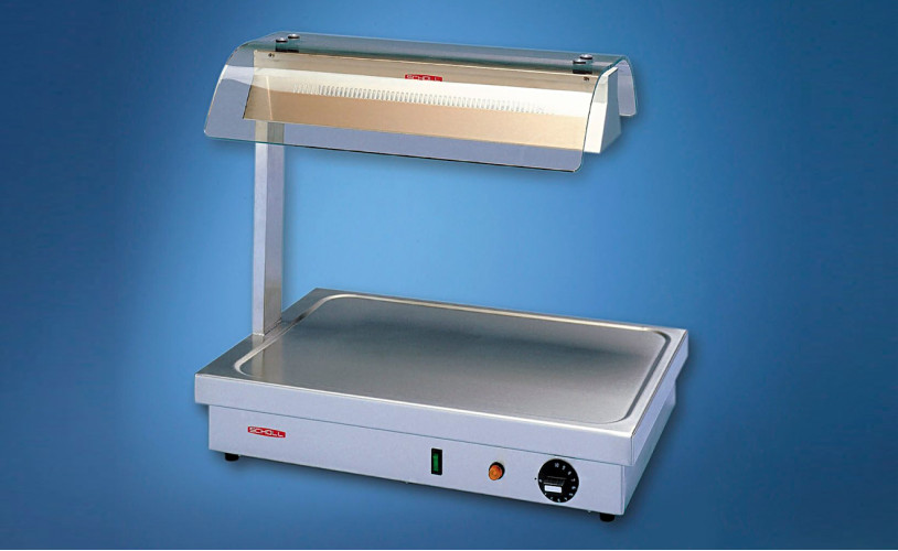 Chrome nickel steel 18/10. With IRK-Halogen-infrared-quartz radiator. Casing with on-off switch. With hot plate, thermostatically adjustable from 300 - 100° and with acrylic glass cover.