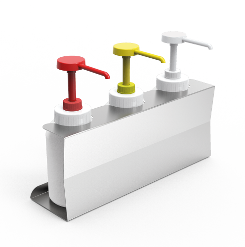 The Set of 3 sauce dispensers with stand support, is a kit that consists of: stand support + red sauce dispenser + white sauce dispenser + yellow sauce dispenser.