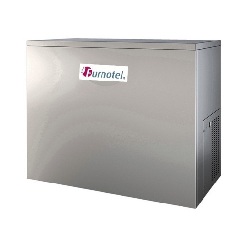 This FURNOTEL ice machine with free-standing sprinkler system is equipped with an exterior body made of AISI 304 Scotch Brite stainless steel, a probe for automatic shutdown of production, an insulated reserve, a white ABS tank, a tilting door, and stainless steel feet adjustable in height from 110-150 mm. Cooling is by air or water (recommended for built-in machines or in case of high ambient temperatures). Refrigerant gas: R404 Power supply: 230 V