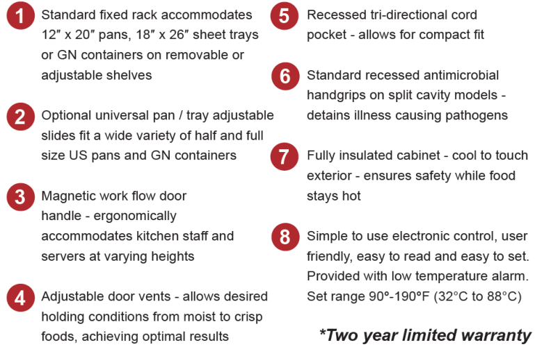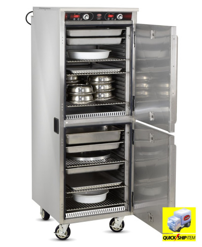 FWE's HLC-2127 commercial food warmer series provides a soft, radiant, uniform heat that gently surrounds food to provide better appearance, taste and longer holding life. These high volume holding cabinets are fully insulated, constructed of long-lasting, easy to clean and maintain stainless steel, and a cool to touch exterior, which ensures safety while food product stays hot. This design achieves unmatched results with faster heat up times and more consistent temperatures than any competitive models. The HLC212799 consists of two individually temperature controlled compartments for the ultimate in foodservice flexibility. Controls are up-front and easy to read and set. No guesswork is needed. Simply dial in the temperature selection for each cavity from 90 - 190F and walk away!