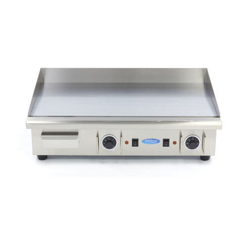 The electric griddle has a smooth griddle made of 10 mm thick steel with a chrome mirror finish and is suitable for high production and daily, intensive use. The smooth chrome griddle has an even heat distribution so that food is cooked evenly. Under the griddle is a removable tray for collecting fat and the griddle is equipped with high stainless steel splash guards to prevent oil splashes. Together with the ergonomic design of the griddle, this ensures pleasant and safe working. The stainless steel housing, splash guards and griddle are easy to clean. With this griddle you can grill large quantities of food at the same time.