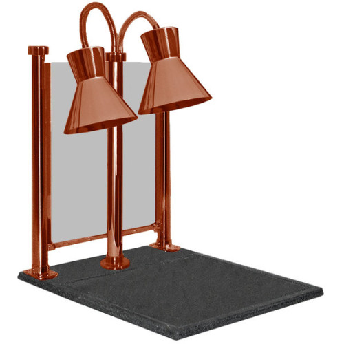 Keep your most popular meats, breads, and more hot as you cut and serve them with the Hanson Heat Lamps DLM/300/CC/ST/BR dual lamp 20" x 24" brass carving station! This carving station features two bulb warmers on a tall, center stand to provide adequate clearance for you to cut up a delicious meal in front of your customers. It also provides ample lighting to showcase product, making it great for butcher shops, cafes, buffets, catered events, and other display venues.