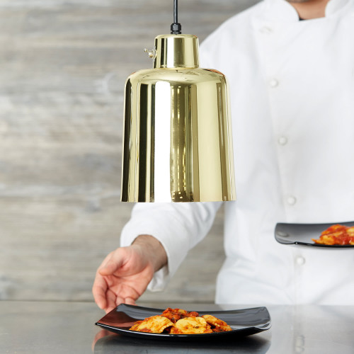 Create an inviting atmosphere and let customers know you have delicious, warm food ready with the Hanson Heat Lamps 700-C-BR decorative ceiling mount heat lamp in an attractive brass finish! This lamp features a 7" x 10" rounded aluminum shade that brings a classic touch to your establishment.