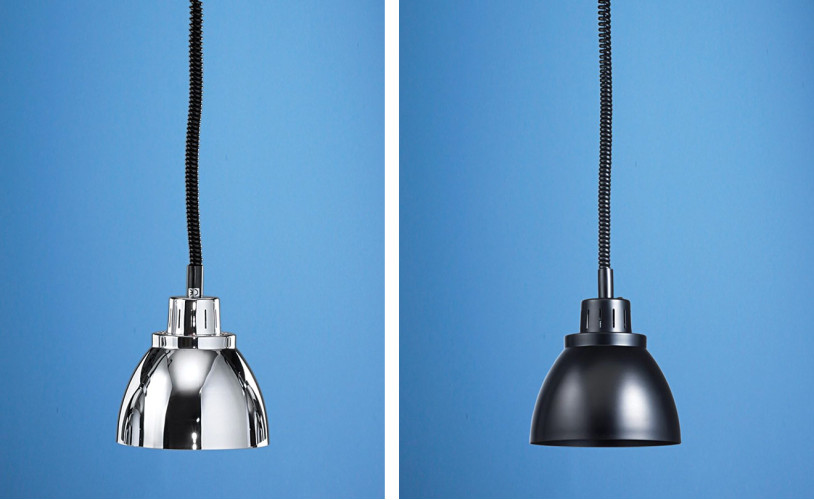Lamp shade black or chromium plated. Diameter 240 mm. With helix cable, continuously adjustable from 850 - 1700 mm. Complete with 250W-infrared radiator white light. Rosette 100 mm, black. Casing with on-off switch.