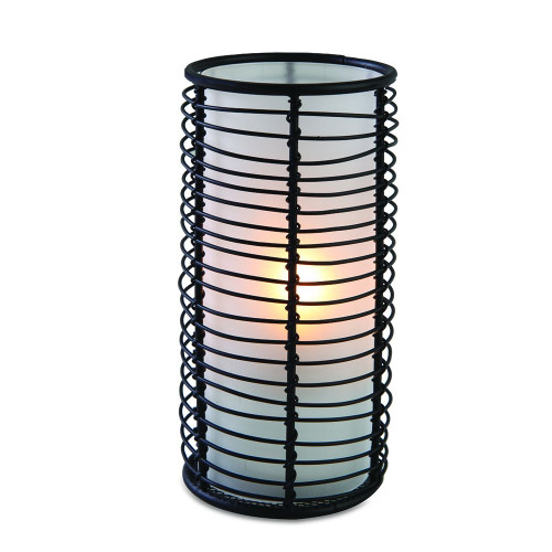 Geometric, black base paired with a frosted cylinder offers a contemporary tabletop look.