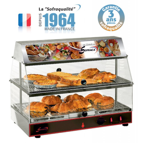 The GN 1/1 heated display case has been specifically designed for snacks, bars, breweries, tea rooms ... It keeps quiches, pizzas, hot or at constant temperature (from 20 to 95 ° C)pastries, croissants, etc ... But also to highlight these products with a totally panoramic view and light block in the upper part.