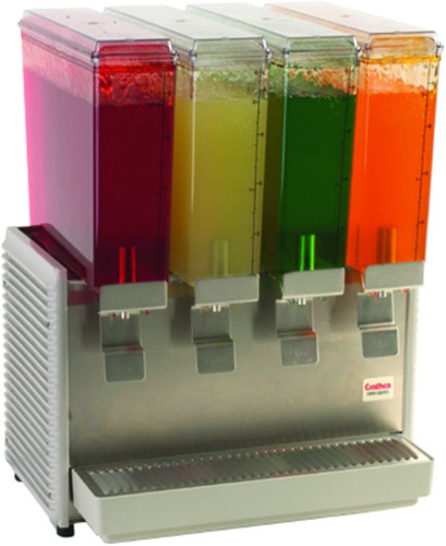 Quad 2.4 gallon cold beverage dispenser, plastic/stainless steel finish. Features: Compact size saves valuable counter space.