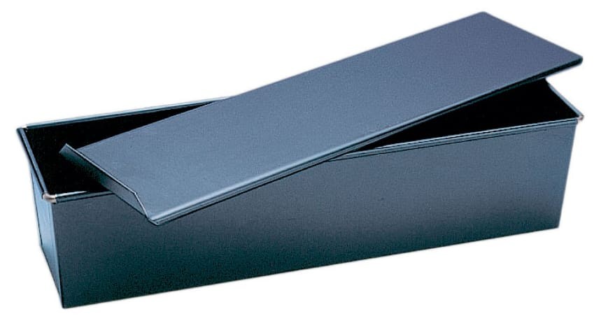 Long loaf pan, with a sliding lid.
