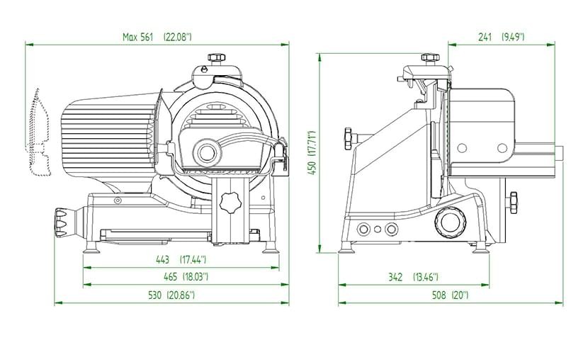 Overall dimensions 530 x 508 x 450 mm Installation area 443 x 342 mm Blade diameter 250 mm Blade speed 286 g/min Slice thickness 0 to 16 mm Carriage travel 245 mm Electrical protection IPX3 Net weight 20 kg Electrical specifications 230-230V 50 Hz/210W a.c. monophase;