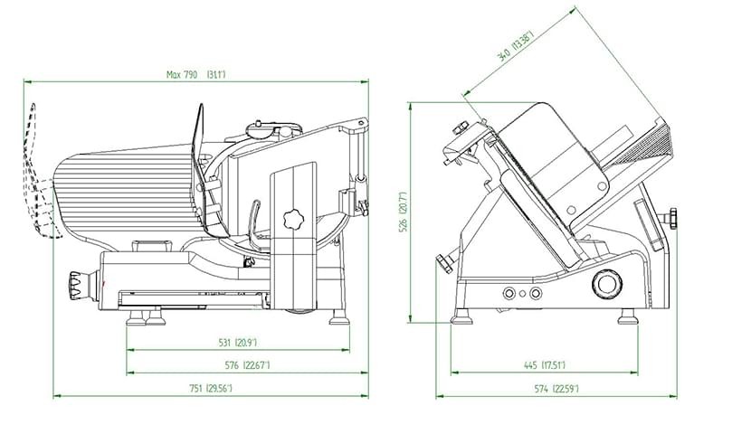 • Technical features - 350 IX Overall dimensions751 x 574 x 526 mmInstallation area531x445 mmBlade diameter350 mmBlade speed230 rpmSlice thickness0 to 16 mmCarriage travel361 mmElectrical protectionIPX3Net weight42 kgElectrical specifications230-230V 50 Hz/380W a.c. monophase;