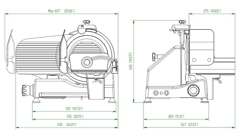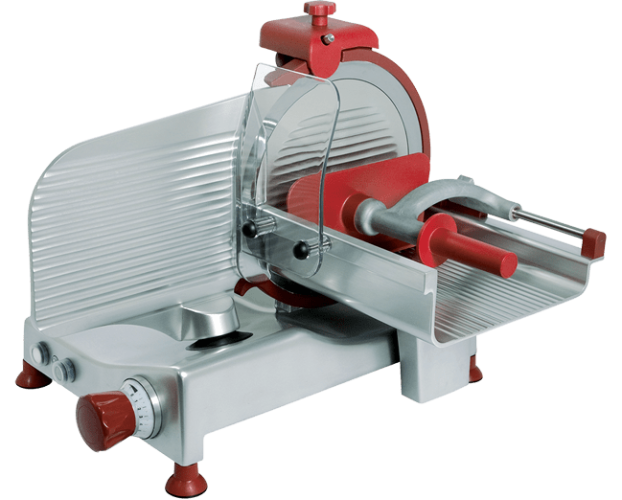 This machine is definitely mandatory for meat slicing, it is small and compact and that makes it ideal for limited space as it can be installed on restricted surfaces. The sliding way of the carriage helps the operator in its use and allows to abtain excellent slices of raw and cooked meat. The product holder can be removed and the maintenance of the machine is simple and quick