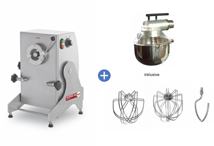 The delivery includes the FEUMA SUPRA 6e universal food processor (400 V) and the 15 L mixing attachment. This universal food processor meets all safety standards. The SUPRA 6e is made of stainless steel and is very easy to clean.