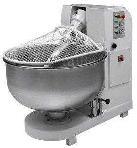 Fork mixer of 160 kg dough with lift able head and idle bowl. Work cycle can be manual or automatic, double timed speed, bowl rotation can be regulated by a braking system. Suited for quality, elastic and tenacious dough. The tool’s 45° inclination angle compared to bowl and 45/75 revs/minute speed mean the machine is suited for special dough mixtures like the French baguette. The tool conformation and its double rotation speed allow very quick kneading times, by keeping unchanged the performance of elasticity and toughness of the dough. The bowl is in polished stainless steel. Driven by a trapezoidal belt system and oil bath worm reduction unit. The machine conforms to applicable European Directives and is guaranteed 2 years.