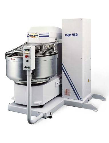 Spiral kneader Mac.Pan MSPV300 with a self-tilting bowl, is equipped with two motors and timers. The belt drive makes the operation of the equipment quiet and safe. Kneading parts and bowl are made of high quality food grade stainless steel. The body is covered with paint, resistant to mechanical damage. The rotation of the working body - the hook is synchronized with the rotation speed of the bowl. This ensures thorough mixing of all components and shortens the kneading time. A lifting mechanism is provided that can raise the bowl to a height of 1800 mm, as well as a hydraulic tilt system. Unloading is done into a dough divider.
