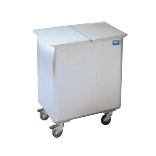 4 swivel wheels - 2 wheels with brake Construction 18/10 stainless steel, 1.2 mm thick on wheels ø 80 mm Handle Lid with central hinge (Flip-Flap) Capacity: 129 L (390 x 565 x 600 mm) Dim .: 560 x 385 x 700 mm