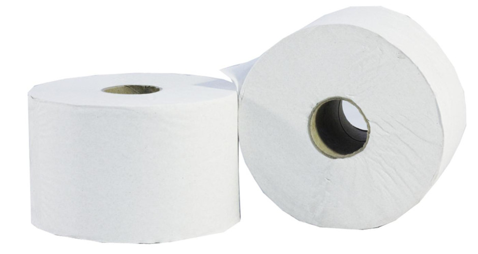 100% recycled 2 ply white tissue, packed 24 rolls per carton
