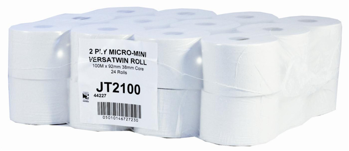 PRO 100m length Versatwin micro jumbo toilet roll on a 38mm core. These rolls fit into the twin roll Versatwin style wall-mounted plastic dispensers. As one roll is used up, a slide can be moved across allowing the next roll to be started allowing the used roll to be replace, ideal for high traffic areas. Our micro jumbo toilet rolls are made from 2 ply white 100% recycled tissue that conforms to the CHSA Soft Tissue standard.