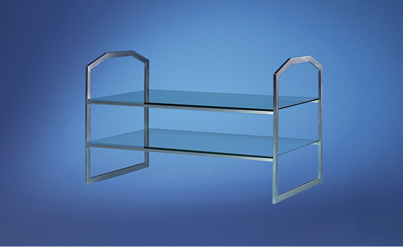 Shelf for glasses, 2-tiers. Frame structure made of chrome nickel steel. 2 glass shelves and sides made of security glass.