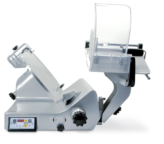 Automatic slicer, technologically at top, with all the good characteristics of the manual model. The machine can have plates differently equipped, like: plate with self-locking clamping device, transparent and removable remnant holder and sliding plate (AB option); plate with transparent and removable remnant holder (E option) or plate with swinging aluminium remnant holder (EF option