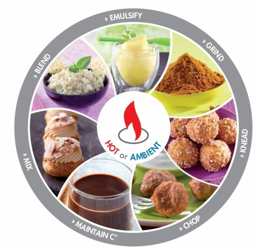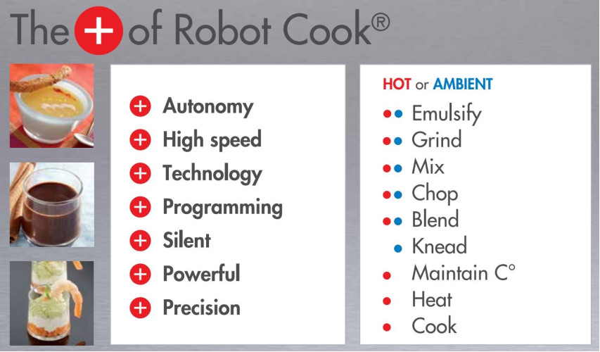The new Robot Cook machine manufactured by Robot Coupe can emulsify, grind, blend, chop, mix and knead to perfection, the only professional cooking cutter blender on the market. It is the ideal appliance, whether the recipes you are making are hot or cold, sweet or savory.