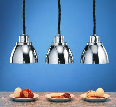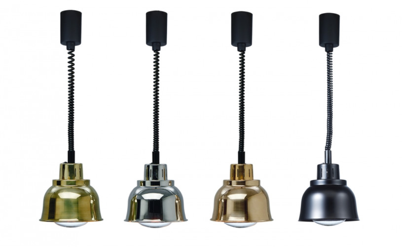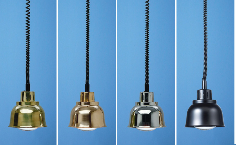 Lamp shade made of solid brass, solid copper, black or chromium plated. Diameter 225 mm. With helix cable, continuously adjustable from 850 –1700 mm. Complete with 250W-infrared radiator white light. Rosette 100 mm, black.Casing with on-off switch.