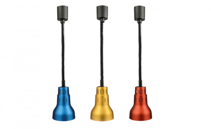 Lamp shade made of anodized aluminium, colours blue, golden or red anodized, 150 mm diameter, with helix cable, continuously variable from 850 – 1700 mm, including 250 W-infrared radiator white light. Rosette 80 mm, black. Casing with on-off switch. Also available with 250 W red light infrared radiator. E.-Connection: 230 V/250 W. Shortened cable (adjust able from 500 – 1000 mm) on request.