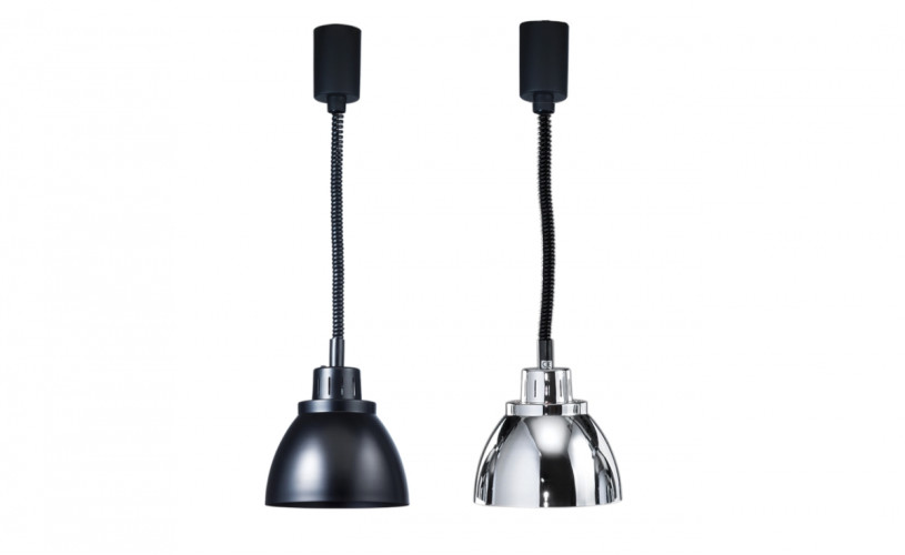 Lamp shade black or chromium plated. Diameter 240 mm. With helix cable, continuously adjustable from 850 – 1700 mm. Complete with 250W-infrared radiator white light. Rosette 100 mm, black. Casing with on-off switch.