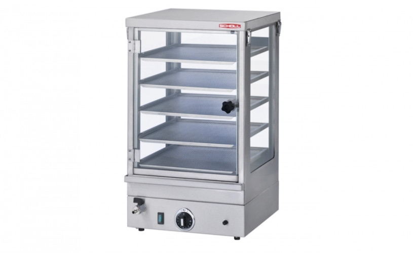 Design: Chrome nickel steel 18/10, cabinet vitrified on all sides, with thermostat, adjust - able from 30 – 110 °C, heating with overheat protection, 5 perforated intermediate shelves. Slides also suitable for GN-inserts 2/3-65. Device decomposable for cleaning. E-Connection: 230 V – 1,8 kW. 5 Intermediate shelves