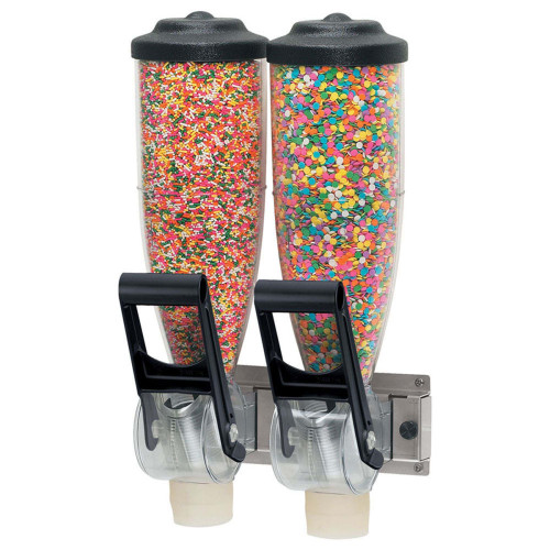 Twin Dry Food and Candy Dispensers have 14 portion settings for exacting recipes. The twin mounting bracket attaches to any vertical surface and needs just 10" of linear vertical space. Go ahead and mount several side-by-side to create an eye-catching flavour station.