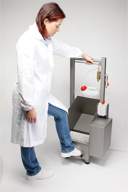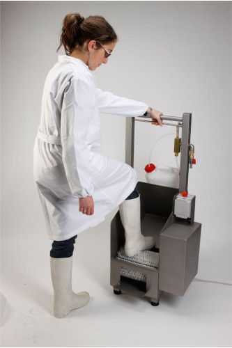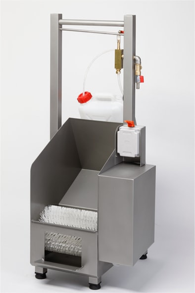 brush rotating machine, designed for washing the sole and back of shoes and work clogs; made to EEC standards with structure entirely in 18/8 steel, equipped with safety drive with automatic stop on release. Provided with detergent dispensing and dosing device.