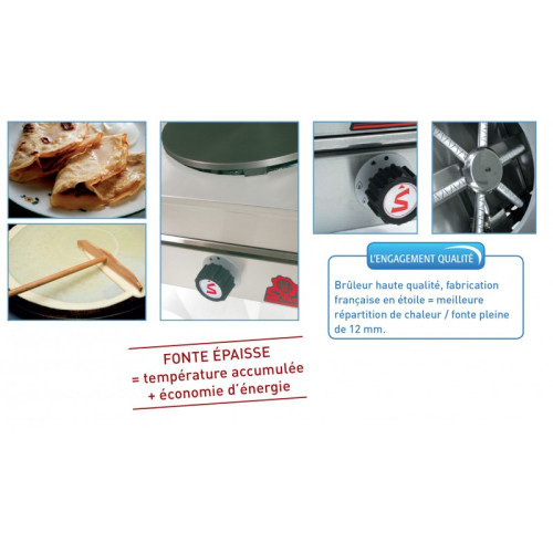 This griddle has a plate cast high quality micro furrowed FG 200 of 350 mm in diameter and 12 mm thick The thick and solid cast iron saves energy due to the concentration of heat. Its thickness also allows a homogeneous cooking of the crepe. It also has a clean drawer that allows easy cleaning and prevents heat loss, safety, pilot light, idle valve and star-shaped burner with baffle. easy ignition and perfect heat distribution throughout the plate.