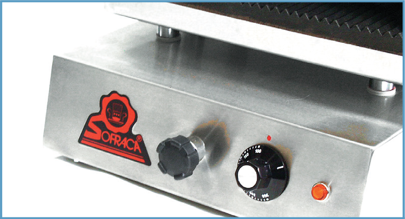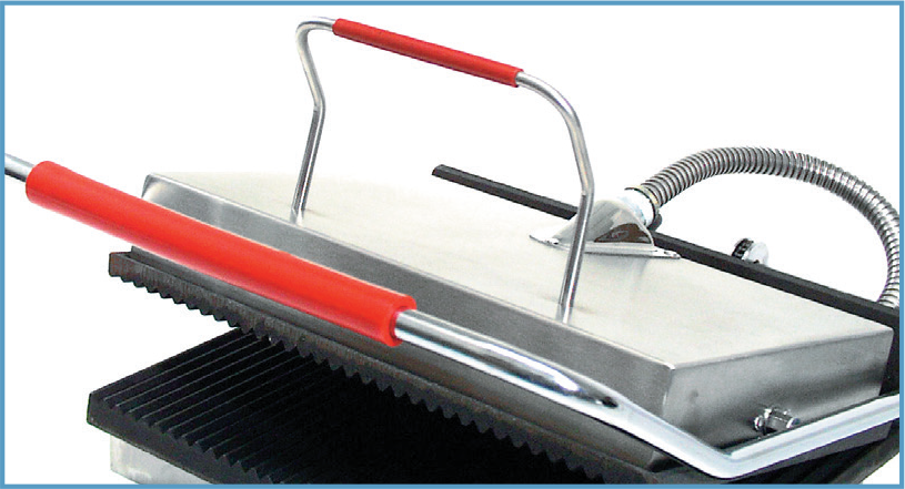 A particularly robust AISI 430 all stainless steel construction , solid cast iron plates which allows a very strong heat accumulation (FGL 200), extra soft upper suspension for easy and light handling, possibility of adjustment by the user the upper plate adapted to the thickness of the product.