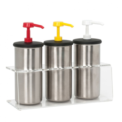 Plexiglas sauces bar complete with push button dispensers on black plastic lid and cylindrical stainless steel containers 0.5 liter, 3-piece.
