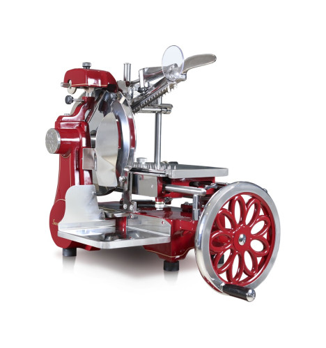 Flywheel slicer mm. 300 - red - Swedlinghaus - AF 300 STYLENew elegant and refined design , based on an artisanal production, these slicers are particularly suitable for cutting raw ham and valid furnishing elements for the home, restaurants, wine bars, clubs, etc. Structure in fire-painted cast aluminum, completely manual operation, parts in contact with the product in stainless steel, blade protection ring, easy disassembly for cleaning, greater distance between the blade and the head, professional blade in 100CR6 tempered steel, built-in sharpener and flowered flywheel as standard.